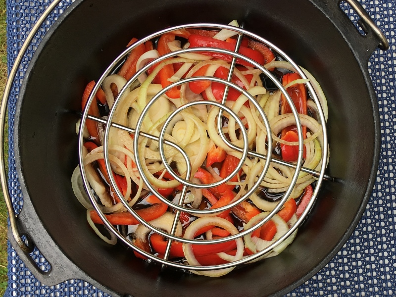 - Gemüsezwiebeln und Paprika klein schneiden und in den Dutch Oven geben.