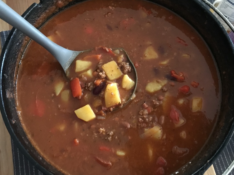 - Kartoffeln, geräucherten Paprika, passierte Tomaten, Fleischbrühe und Worcester Sauce zugeben.