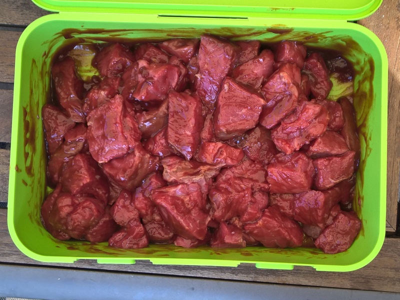 - Rindfleisch in Würfel schneiden und einige Stunden in der Barbecue Soße marinieren.