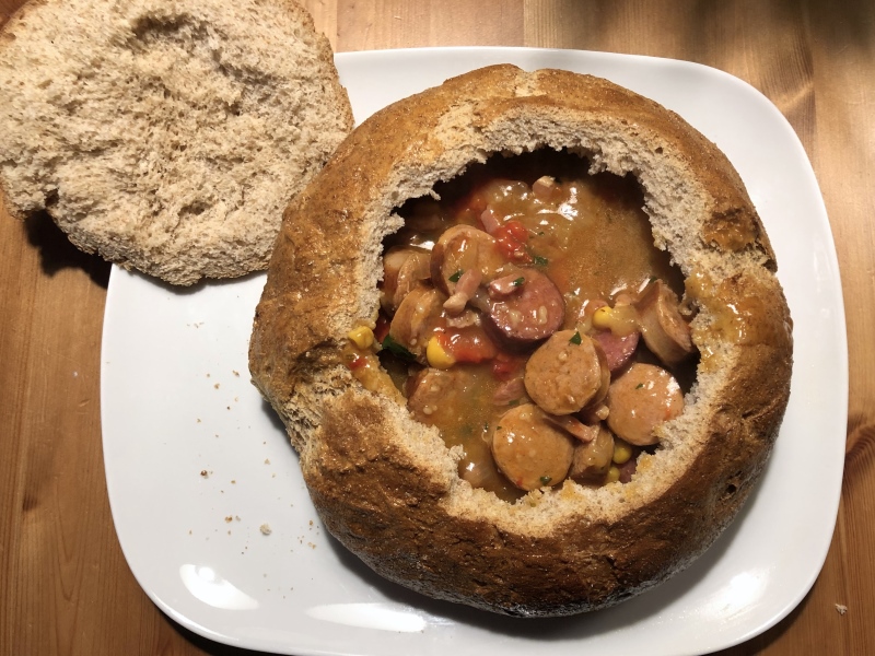 - Optional: Suppe im Brot servieren.