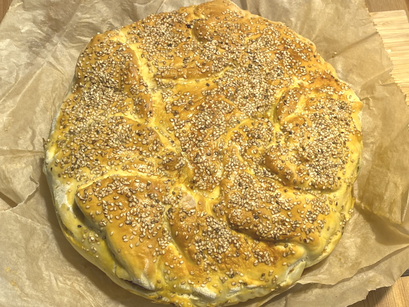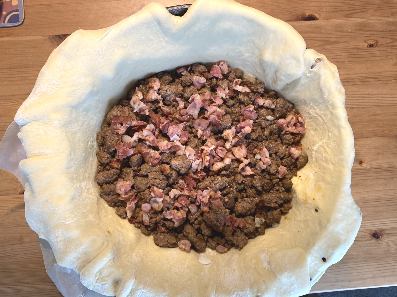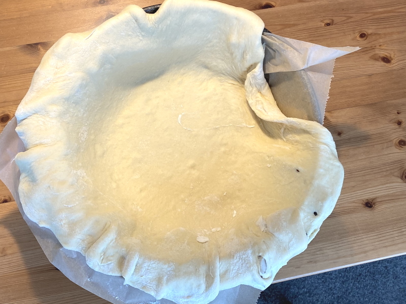 - Mit restlichem Teig verschließen und mit dem verbliebenen Ei bestreichen.