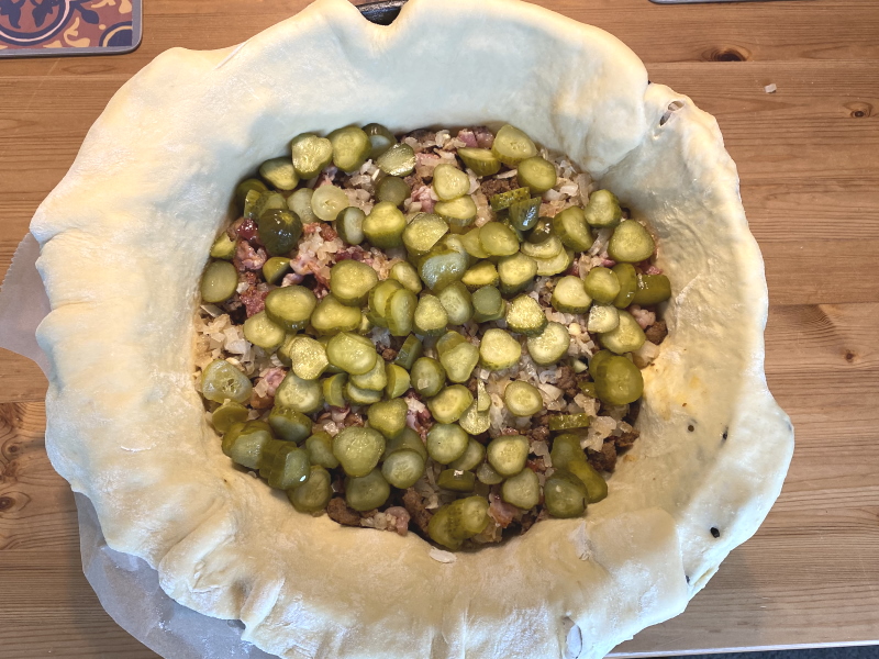- Schichten: Hackfleisch, Speck, Zwiebeln/Knoblauch, Gurken, Senf, Ketchup, Käse.