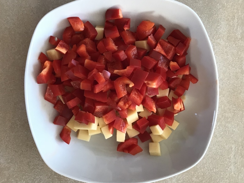 - Käse und Paprika würfeln, Pistazien zugeben und unter das Brät heben.