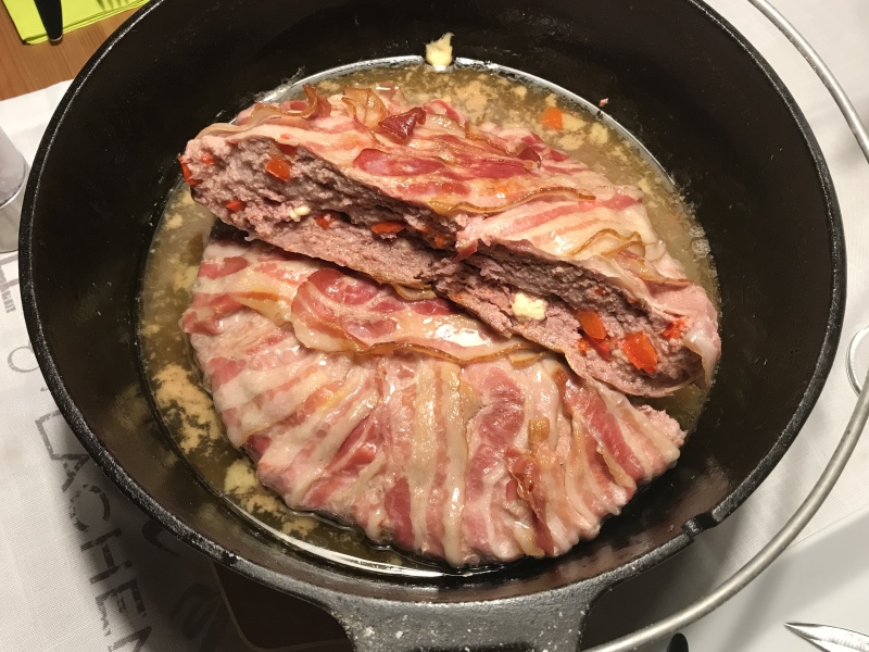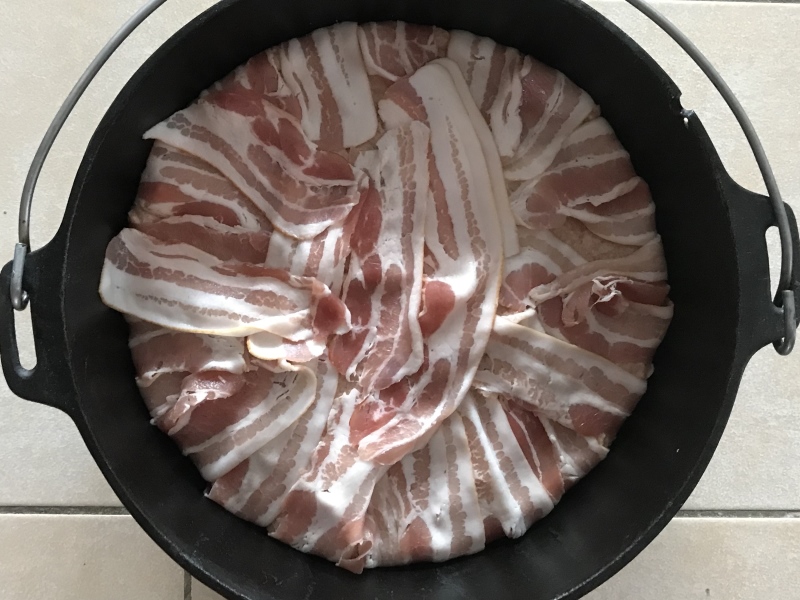 - Dutch Oven mit Bacon auslegen und das Brät einfüllen.
