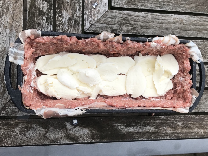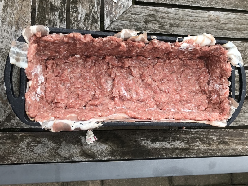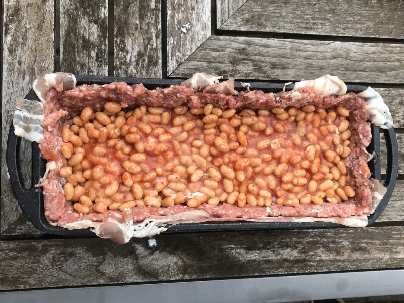 - Eine Schicht Baked Beans (mit scharfem Paprikapulver gewürzt) einfüllen und mit Hackmasse abdecken.