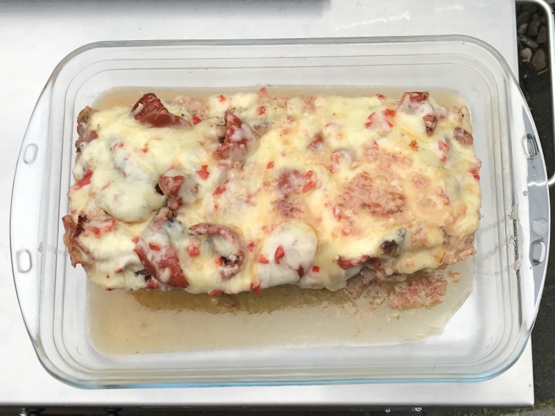 - Bei 70°C Kerntemperatur mit Käse‑Peperoni‑Mischung belegen.