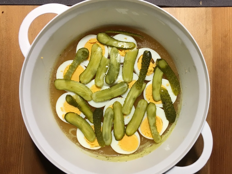 - Eier und Cornichons auf die feste Brühe legen.