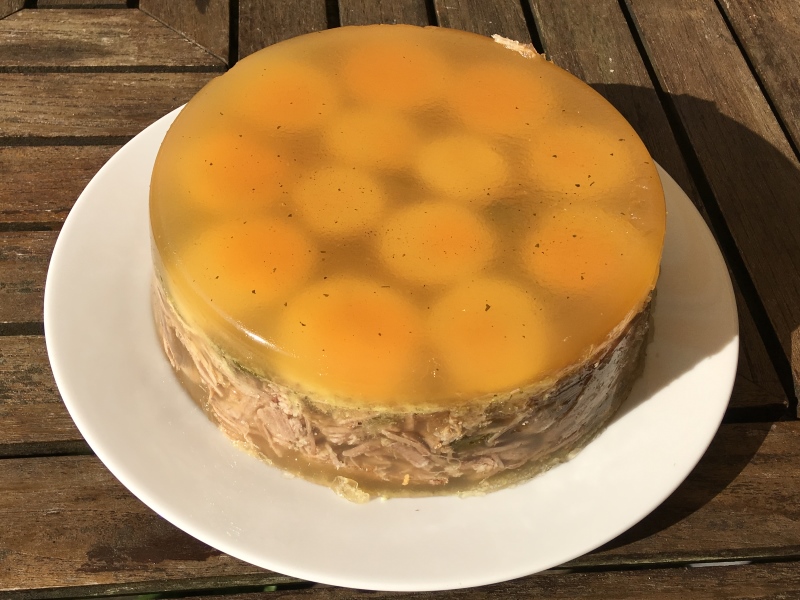 - Mit der restlichen Brühe auffüllen und vollständig im Kühlschrank fest werden lassen.