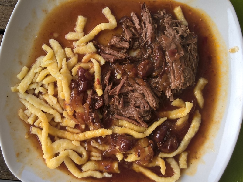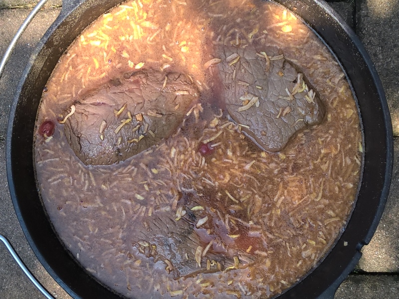 - Braten aufschneiden und weitere 15 Minuten in der Sauce köcheln lassen.