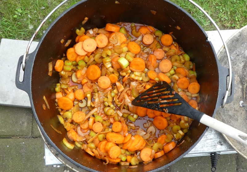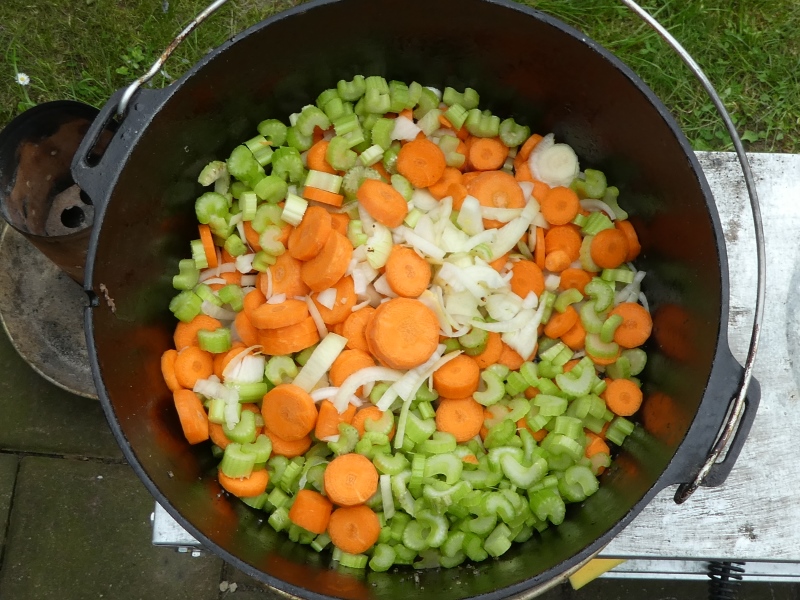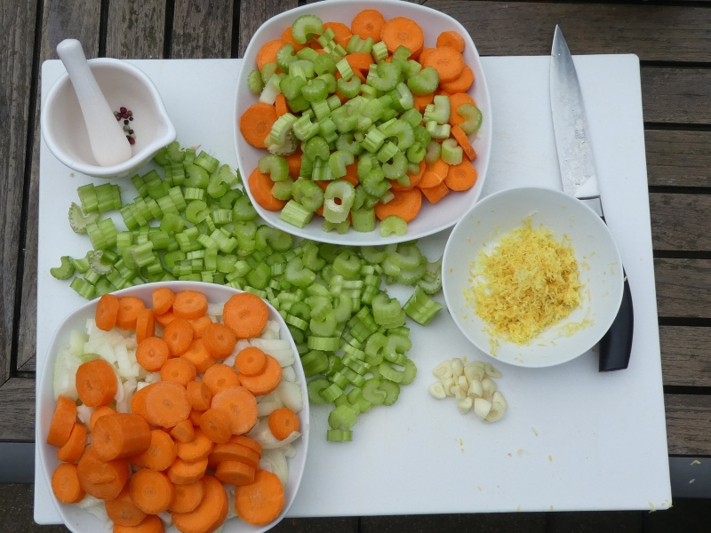 - Sellerie, Zwiebeln und Karotten in Scheiben schneiden.