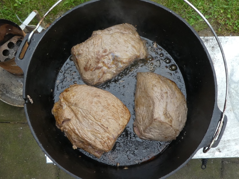 - Fleisch salzen, in heißem Rapsöl anbraten, pfeffern und herausnehmen.