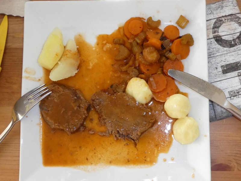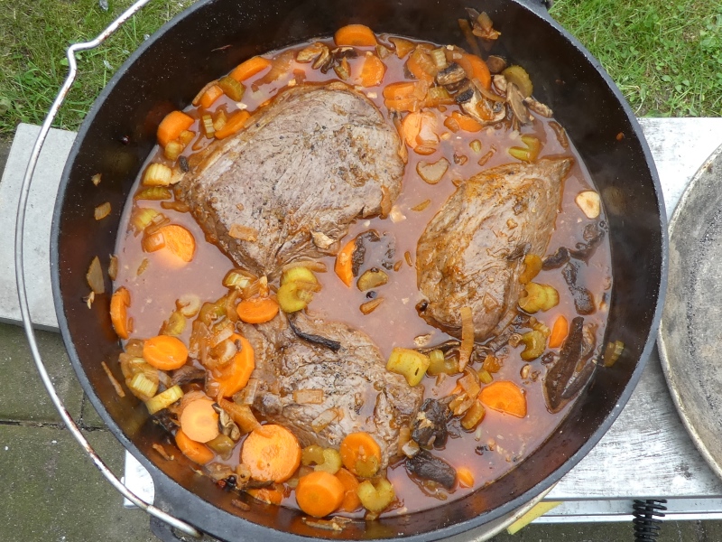 - Fleisch aufschneiden, zurück in den Topf geben und kurz aufkochen.
