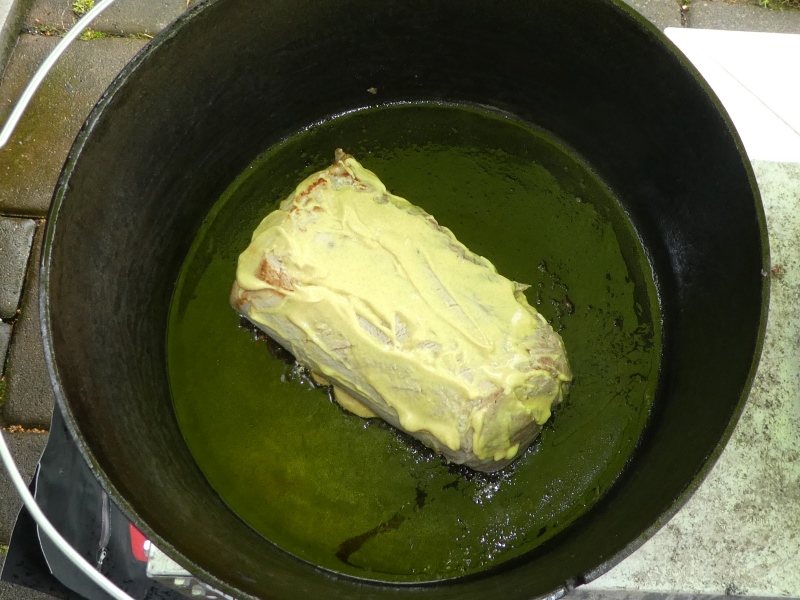 - Schweinelachsbraten mit Öl bestreichen und mit Salz und Pfeffer einreiben.