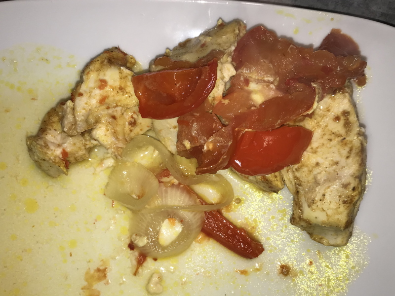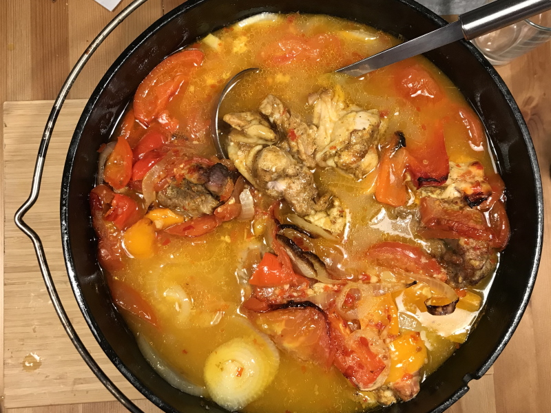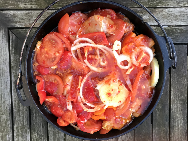 - Fleisch mit Paprika und den restlichen Zwiebeln schichten.