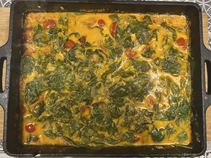 - Spinat und Gewürze (ohne Salz) zugeben, 5 Minuten kochen lassen.